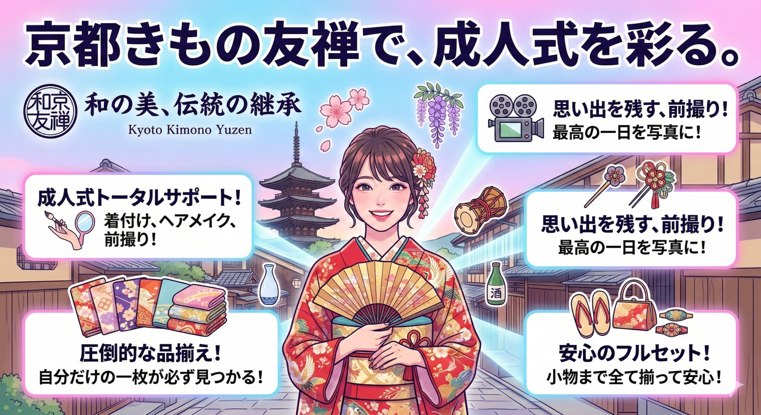 京都きもの友禅は、昭和46年創業の老舗振袖専門店です。成人式の振袖レンタル・購入を中心に、前撮り記念写真や当日の着付け・ヘアメイクまで、成人式に必要なすべてをトータルサポートしてくれます。