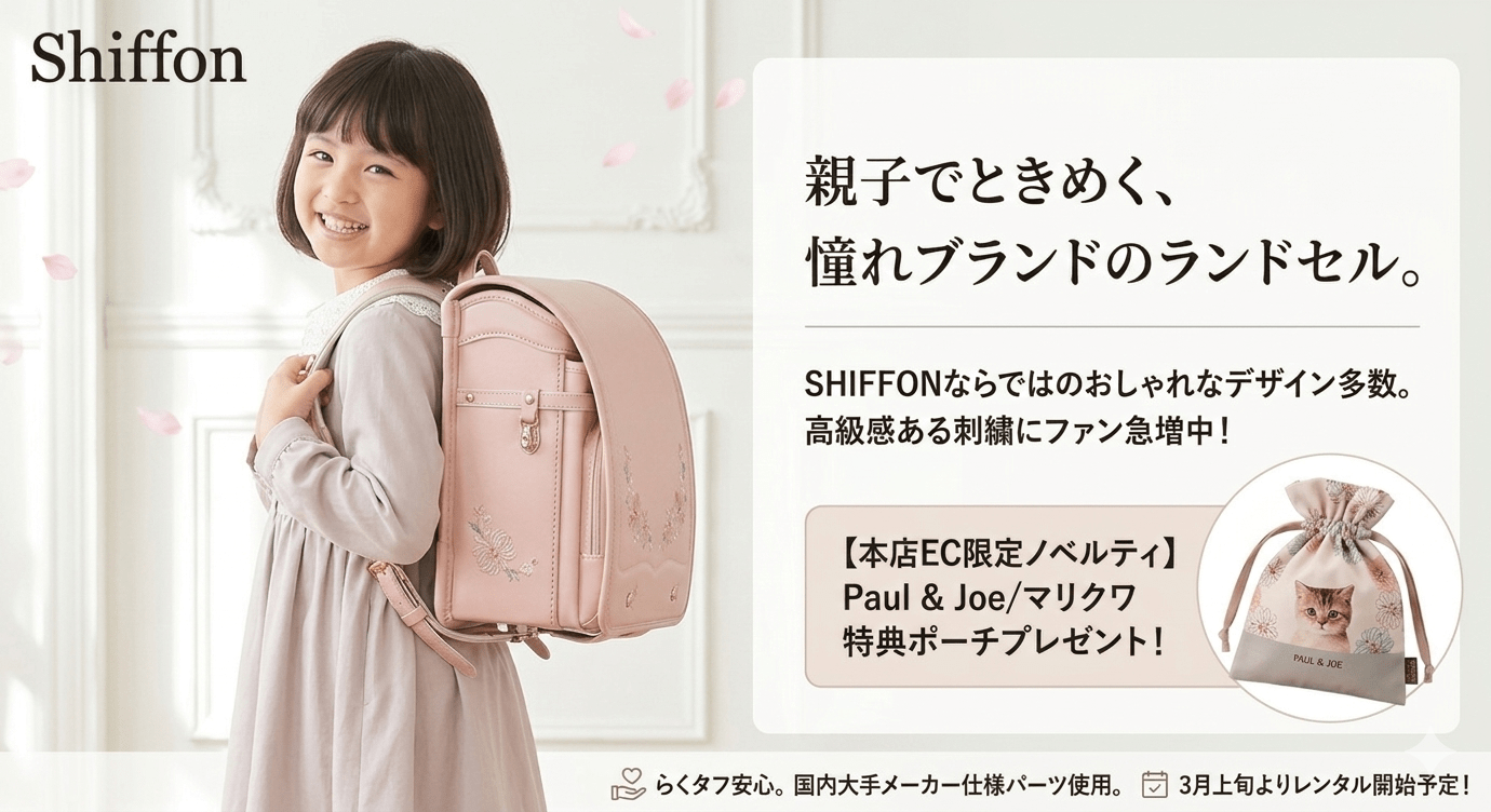 SHIFFON(シフォン)は、国内外の人気ブランドとライセンス契約を結び、ランドセルを製造・販売するデザイナーズランドセルブランドです。株式会社SHIFFONが運営し、「らく・タフ・安心」を設計思想に掲げたランドセルは、2019年の販売開始以来、延べ2万人以上のお客様に選ばれてきた実績を持ちます。