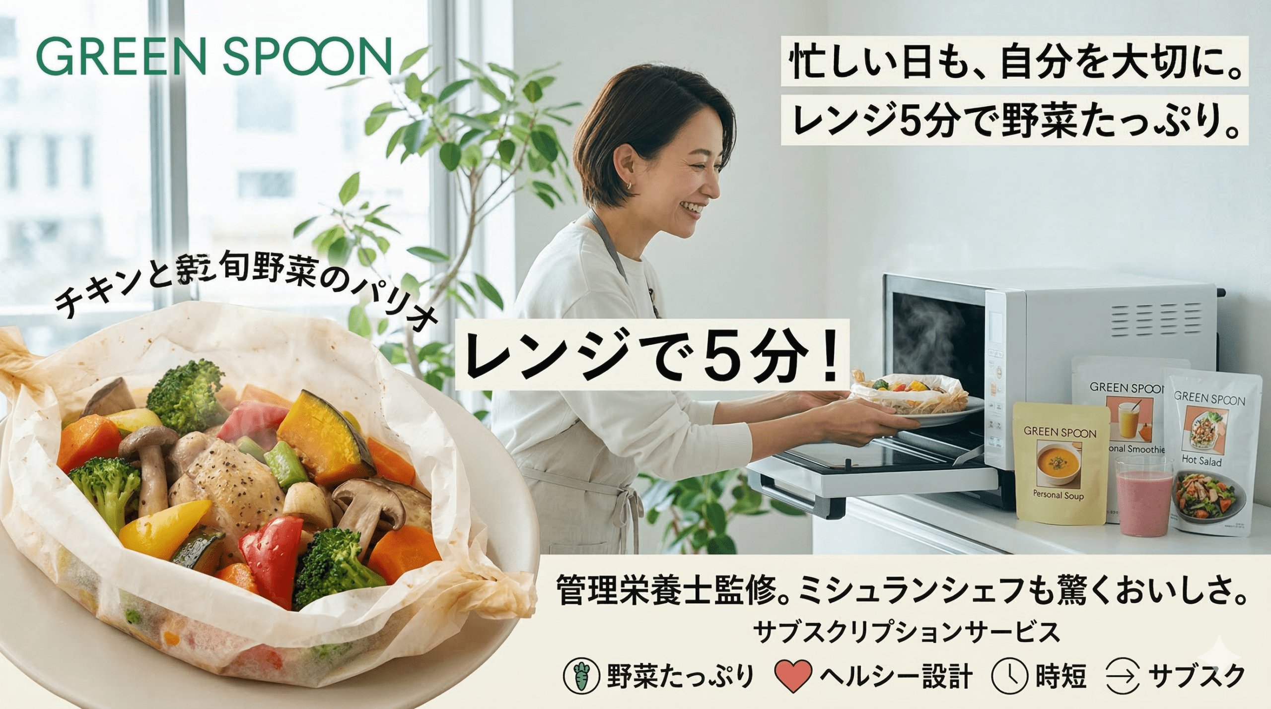 GREEN SPOON(グリーンスプーン)は、「忙しい毎日でも、自分を大切にする食生活を諦めたくない」すべての方にぴったりの宅食サービスです。