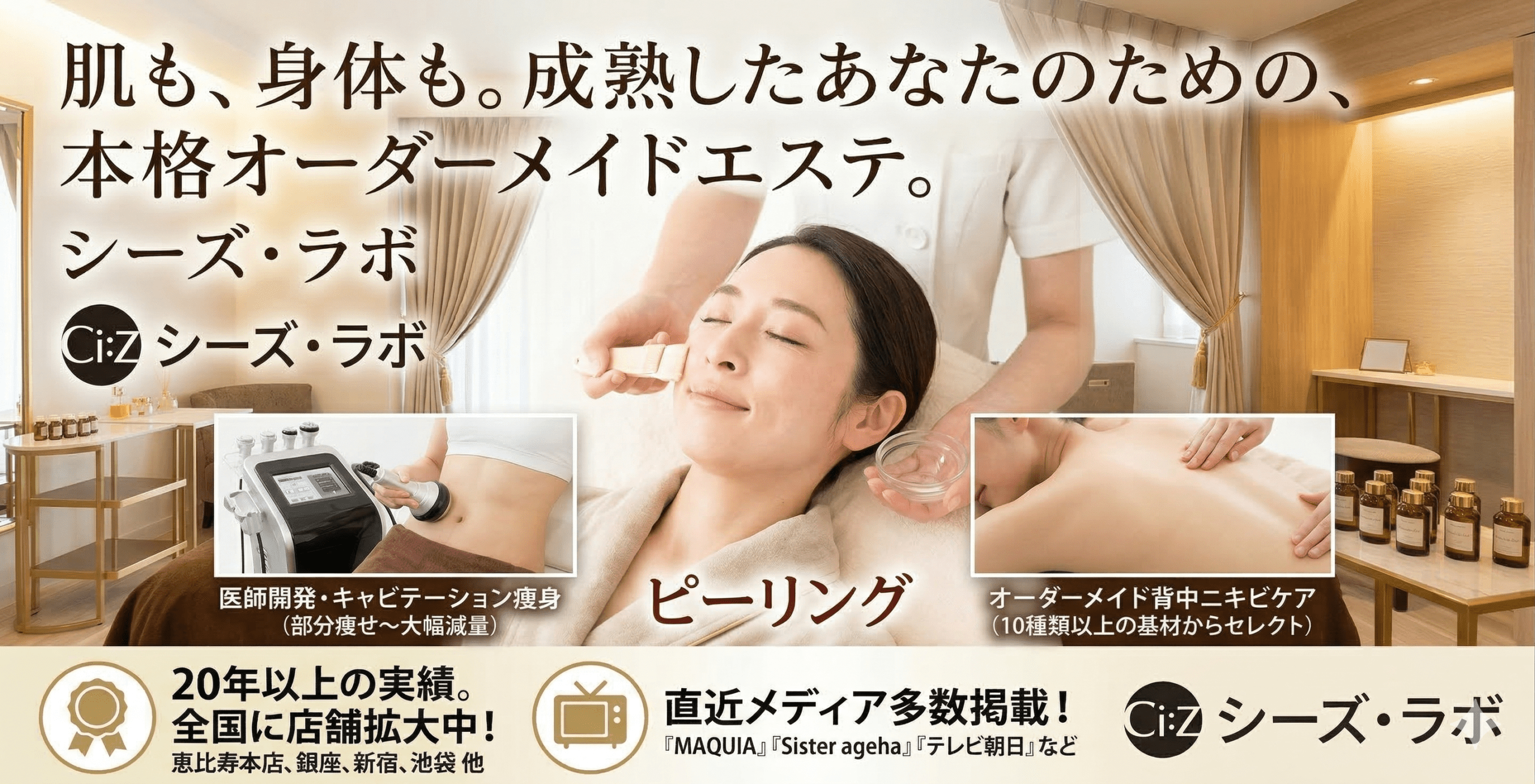 医師監修・施術実績16万件以上・口コミ★4.2以上・10種類以上の基材からオーダーメイドケア・約20種類の最新マシン・全コース初回5,500円・全室完全個室・TV・有名雑誌掲載実績多数 ── これだけの品質と安心感が揃ったメディカルエステは、シーズ・ラボだけです。