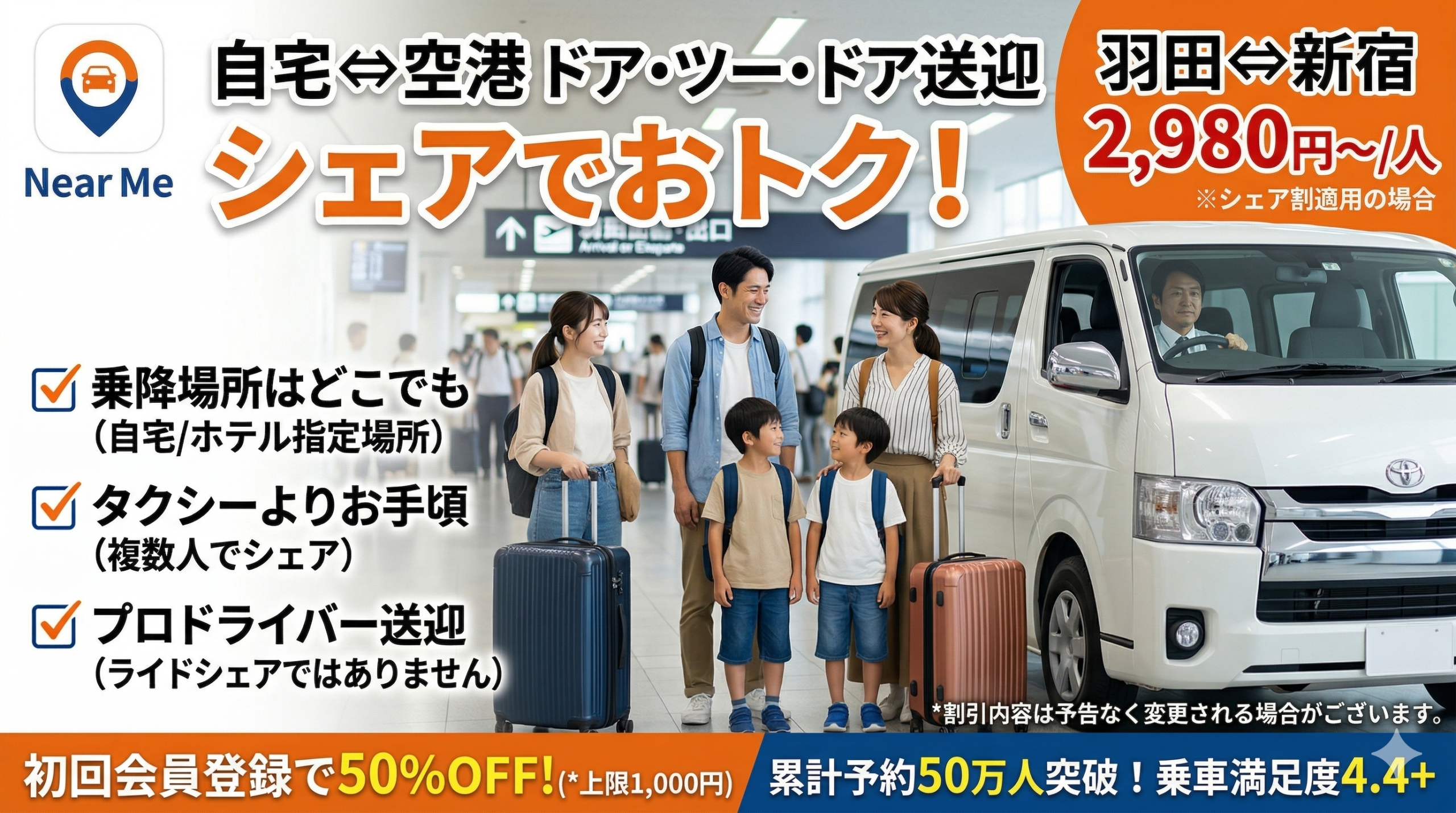 この記事では、Near Meの特徴・料金・割引・対応エリア・実際の口コミまで徹底的にまとめました。空港への移動で悩んでいる方は、ぜひ最後まで読んでみてください。