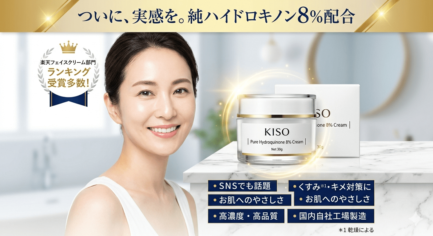 そんな方にぜひ知っていただきたいのが、楽天フェイスクリーム部門ランキング多数受賞・類似商品トップレベルの純ハイドロキノン8%高配合で、プチプラ価格を実現した本格シミケアクリーム「KISOハイドロクリームPHQ-8」です。