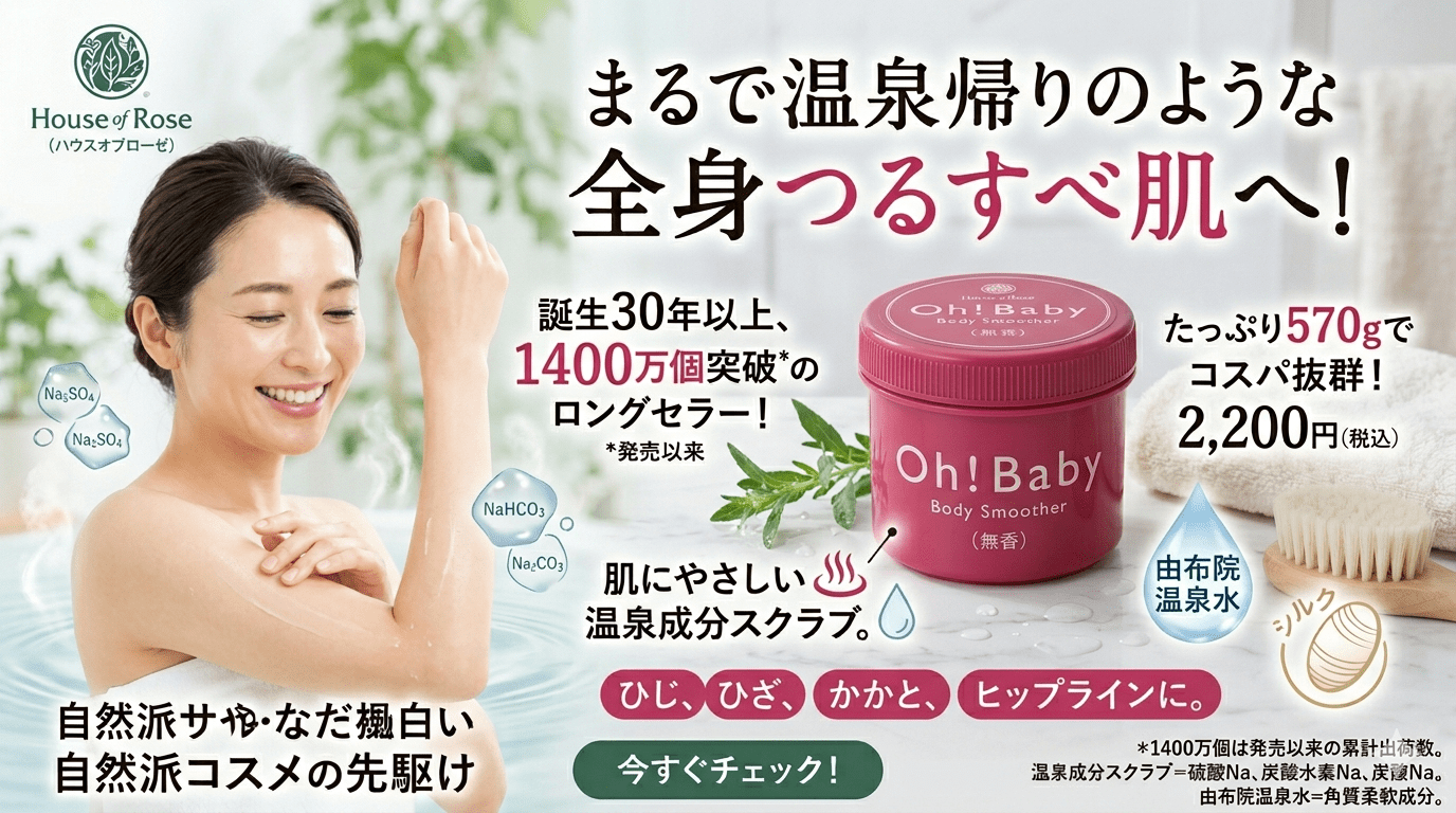 Oh! Baby ボディスムーザー Nは、自然派コスメブランド「ハウスオブローゼ(HOUSE OF ROSE)」の看板商品です。誕生から35年以上の長きにわたって愛され続け、累計1,400万個以上を販売してきたロングセラー中のロングセラー。